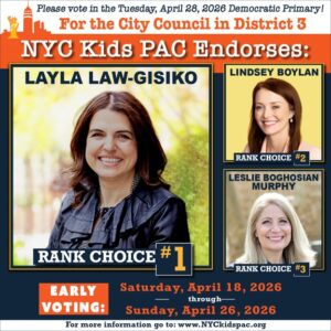 All four filled out our candidates survey, showing a deep understanding on the education issues affecting students and schools in the district and citywide. After discusssion, we decided to rank Layla-Law Gisiko first, and Lindsey Boylan and Leslie Boghossian Murphy second and third.